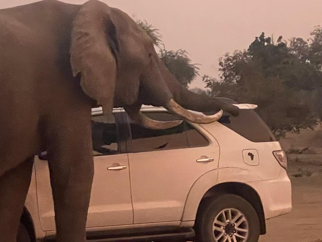 It is difficult to find a signal so we made our way to the camping office where you can access their wifi. The usual monkeys were lurking about and I had been told the elephants like to pass here to eat the pods from the tree that the monkeys drop on the ground. As we were looking at maps and routes, we heard the call “elephant”. There was one and then 2 more. They came pretty close and at one point I tried to take a photo of Geoff on the bench but as he saw the elephant, he made a run for it! I am always amazed by these giants. They are so quiet and so gentle. you can’t hear them coming at all and they step around the smallest things with such grace.